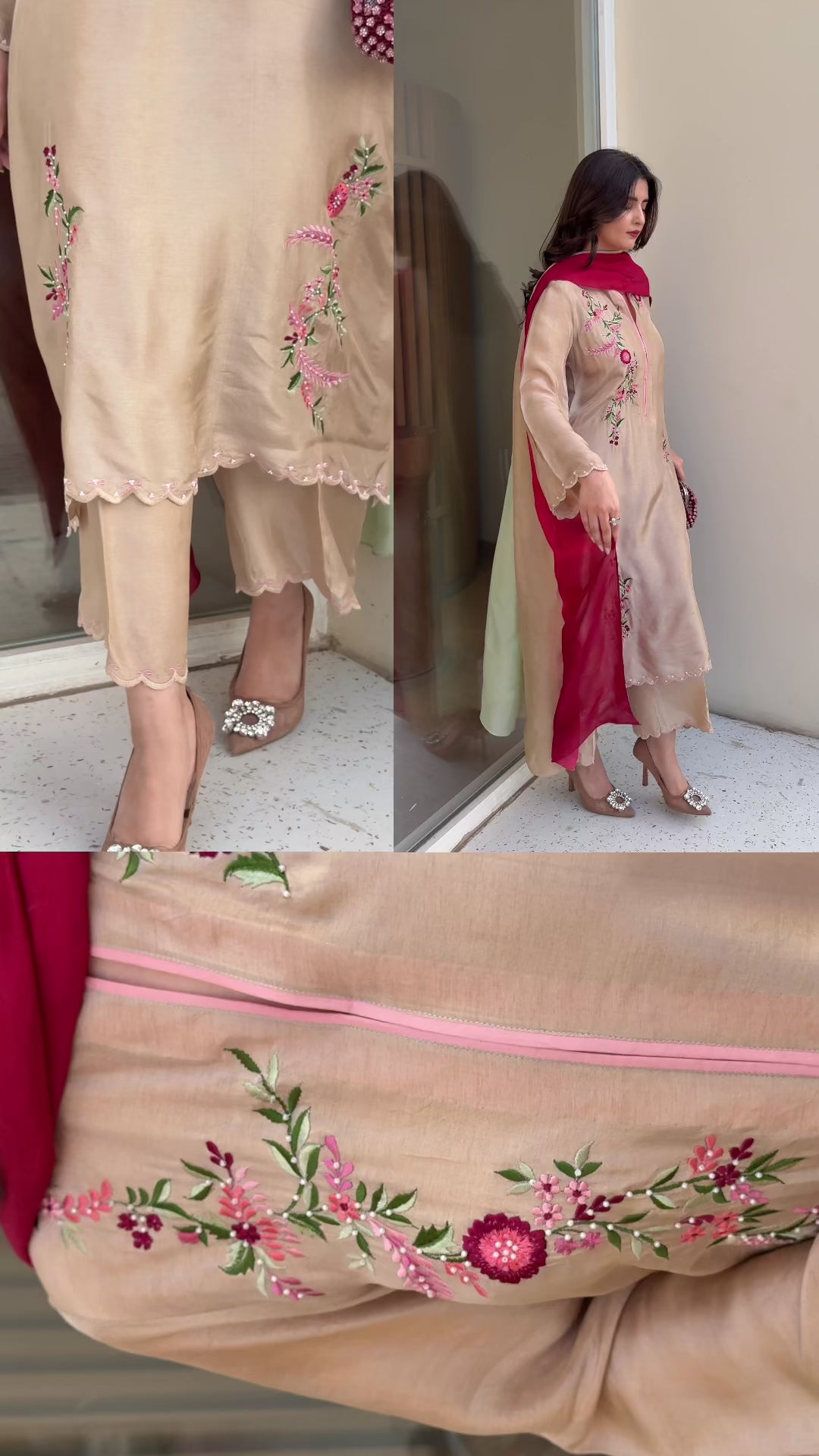 Beige silk shirt adorned with colorful embroidery, highlighted by scalloped cuts on the daaman and sleeves for a graceful look. Paired with embroidered culottes and a soft tie-dye dupatta that adds a vibrant touch to the ensemble.